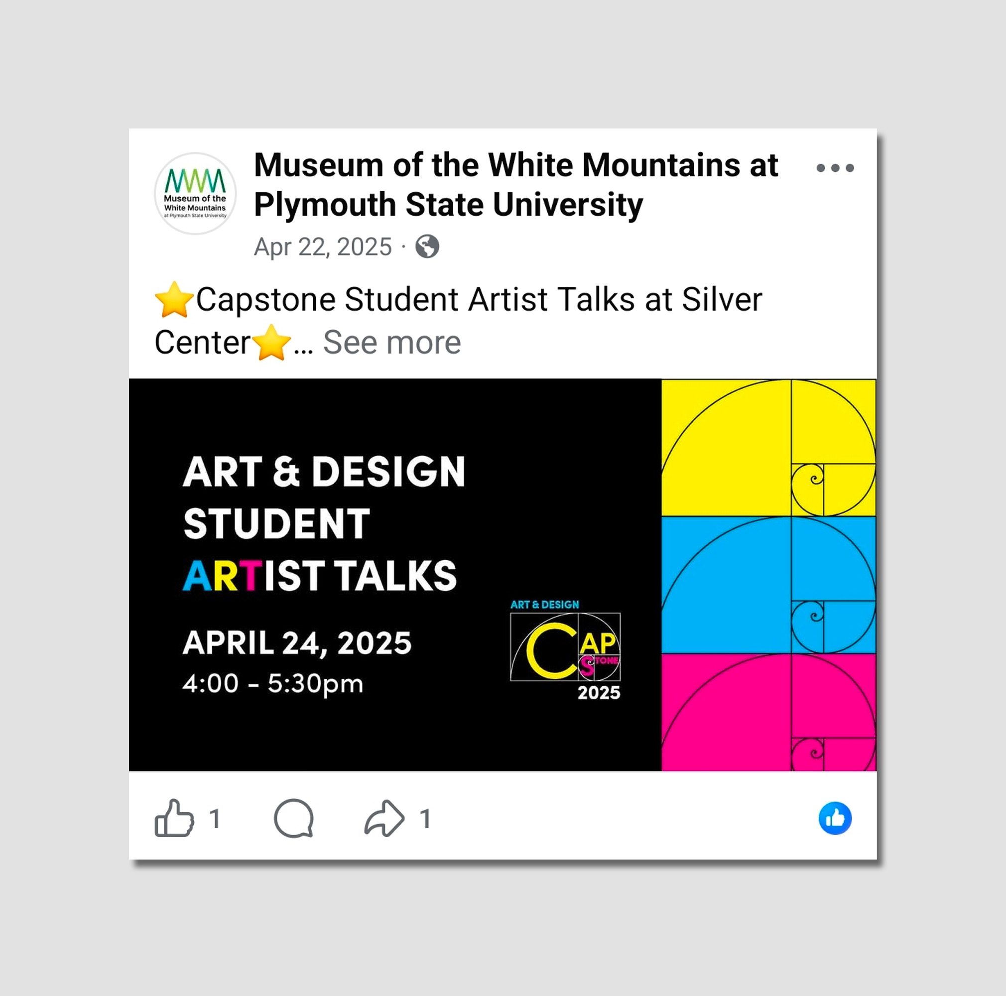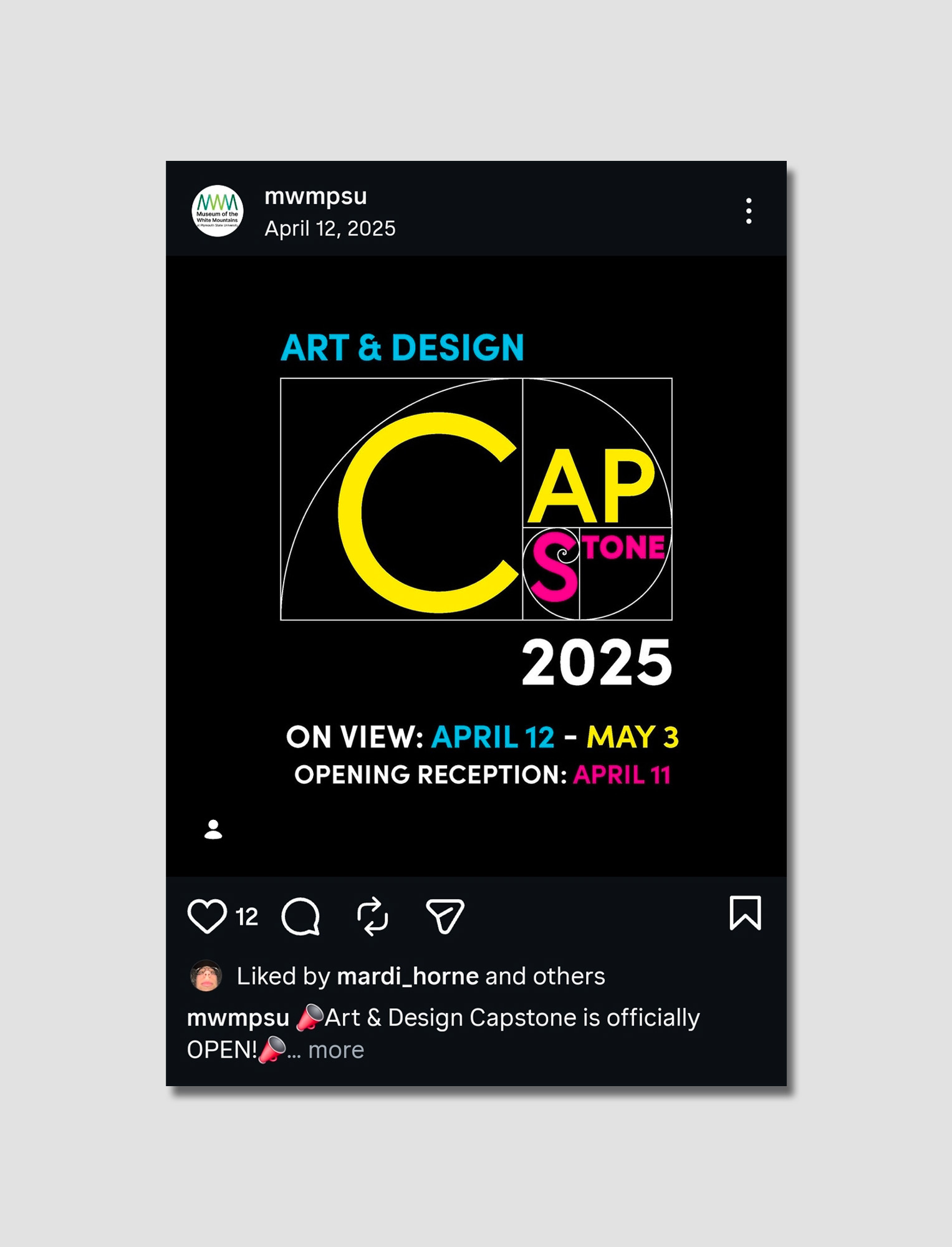 Each year, Plymouth State University’s Art & Design Capstone exhibition highlights the creative work and academic growth of graduating students in studio art and graphic design. For the 2025 exhibition, I refreshed the visual identity by reworking the previous year’s logo and developing a system grounded in the Fibonacci sequence and the golden ratio. These principles offered a shared visual language that felt familiar to both artists and general audiences, allowing the identity to resonate across diverse disciplines.