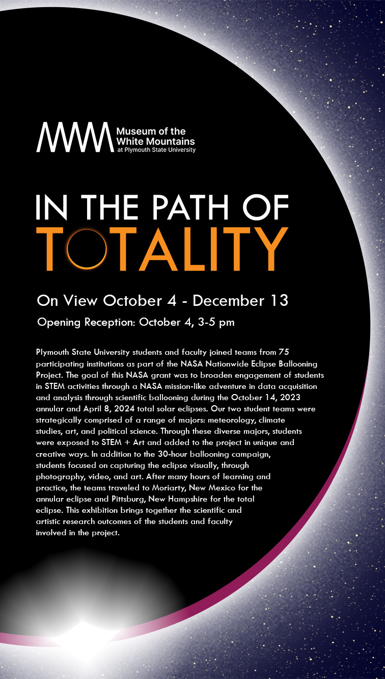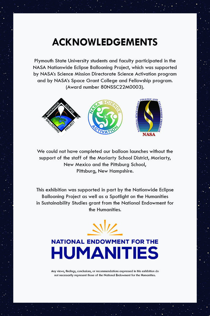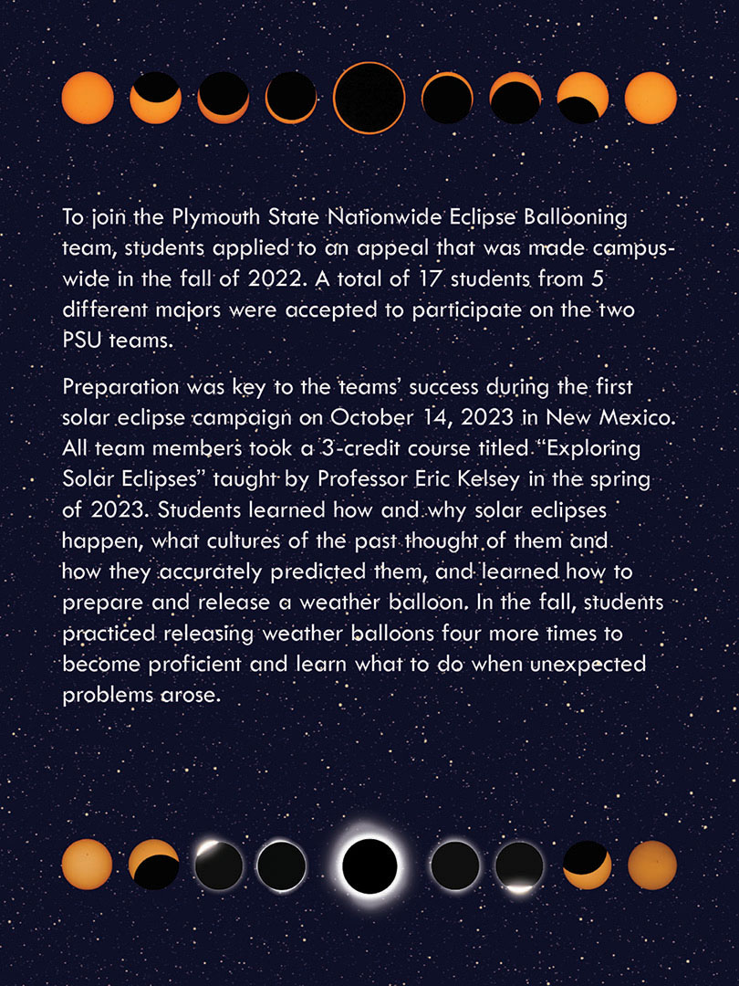 NASA’s Nationwide Eclipse Ballooning Project brought together Plymouth State University students and faculty with 75 other institutions to document the 2023 and 2024 solar eclipses. Contributing through both science and art, students shared their work in an exhibition supported by visual materials designed by Eddy.