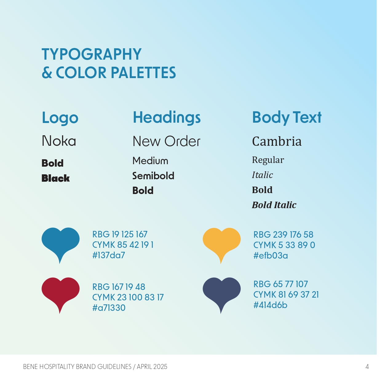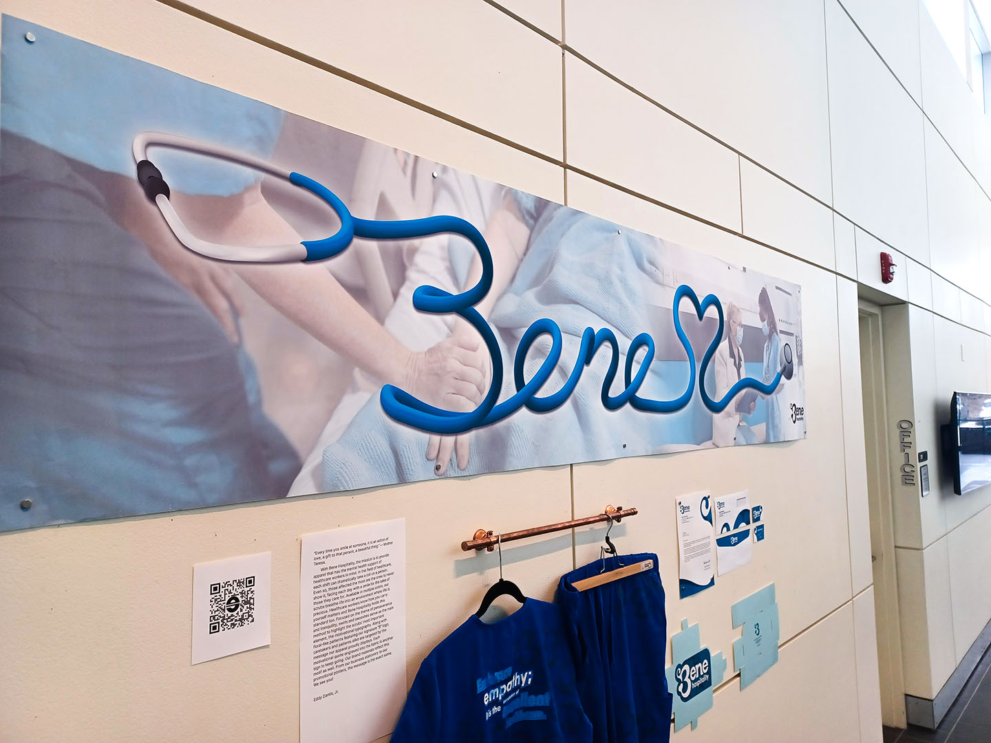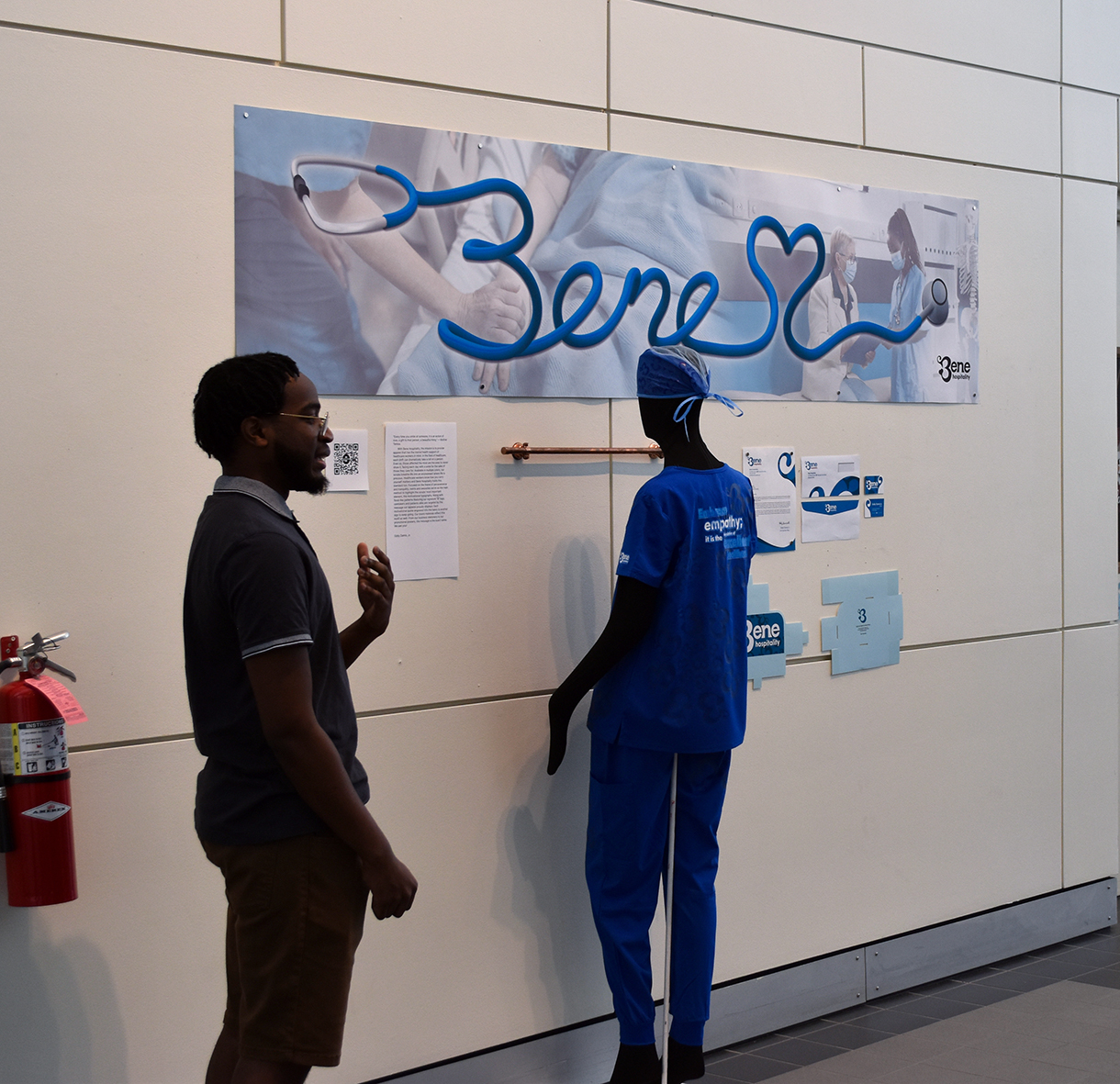 The brand identity grew from the Latin word bene, meaning “good” or “well,” with the letter “B” becoming its visual anchor. Eddy developed a system that was both soothing and whimsical, using a refined color palette, approachable typography, and soft graphic motifs to balance professionalism with warmth. To extend the identity, Eddy designed posters, letterheads, and marketing collateral, culminating in merchandise prototypes. The highlight was a line of scrubs displayed on a mannequin during the senior exhibition, turning the brand’s mission into a tangible experience. Bene Hospitality showed how thoughtful design can provide both function and encouragement for those who dedicate their lives to caring for others.
